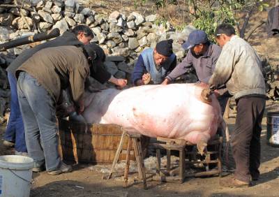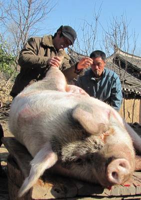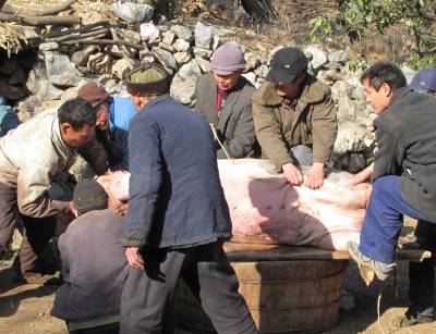 2011年1月9日,湖北郧县刘洞镇杨河村六组村民正宰杀年猪。进入腊月以后,该县各乡镇农户就开始忙着宰年猪、熏腊肉、打糍粑、办年货。