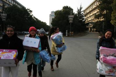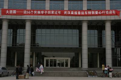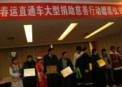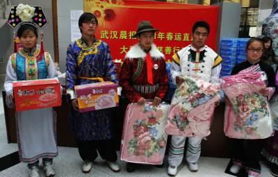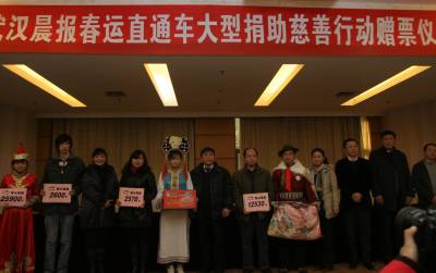 2011年1月9日,武汉中南民族大学,武汉晨报联合6家企业在为少数民族大学生捐赠爱心路费。这次名为”春运直通车”的乘客来自55个少数民族,既有来自西藏拉萨的藏族、云南大理的白族,还有首次让中南民族大学实现56个民族大团圆的赫哲族。他们分别来自武汉大学、中南民族大学、湖北工业大学、中国地质大学江城学院等4所高校。本次直通车除了全款补助路费外,丝宝集团、中国电信武汉公司、康师傅控股、中百仓储、葆春蜂王浆、卓尔控股汉口北批发第一城等企业还为每人赠送一床高级毛毯及一份带有方便面、矿泉水等食品的爱心礼包。