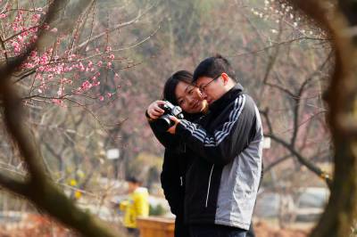 2011年元月9日,市民趁周末的好天气在东湖梅园赏梅。