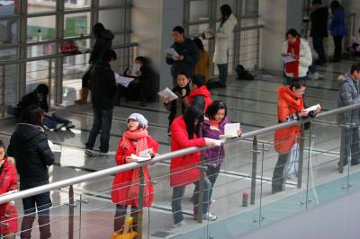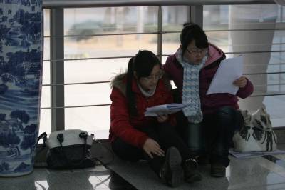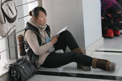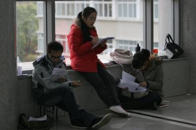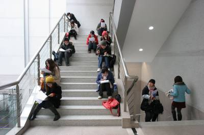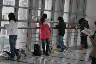 2011年1月9日,武汉中南民族大学,没有占到位置的大学生在学术交流中心的走廊和楼梯里自习。他们有的坐在地上,有的坐在自带的小凳子上,还有的站着看书,复习备考期末考试和研究生入学考试。当日,武汉地区的最低气温-3℃,低温难耐。