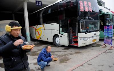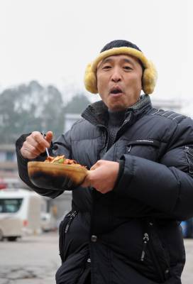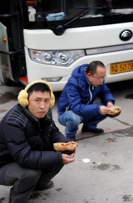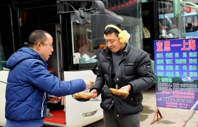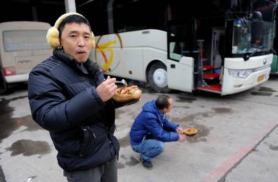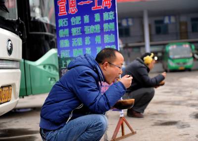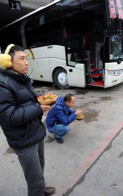 10日,一辆发往上海的客运班车的两位驾驶员在大农用车前就地早餐。春节临近,为确保数以千万计的旅客能够安全回家与亲人团聚,客运师傅、公安民警、公路路政等人员奋战在保畅通、保平安的第一线,他们风餐露宿,风雨无阻地为旅客平安回家、平安出行提供保障。本报视界网宋文摄