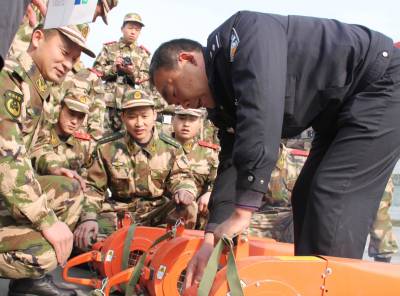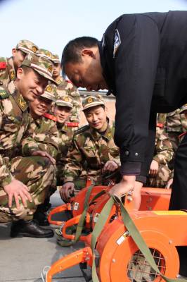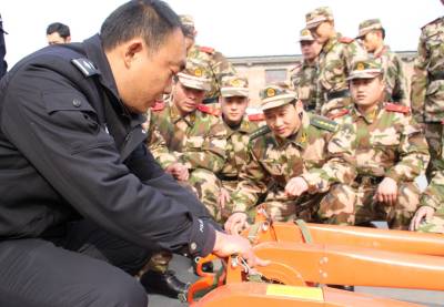 1月7日,森林警察大队官兵正在为武警中队官兵讲授风力灭火机的使用方法。当天湖北郧县公安局森林警察大队官兵为该县武警中队赠送风力灭火机、阻燃扑火服、消防桶等消防器材,并详细讲解、演示使用方法,两警表示通力协作共筑冬季森林”防火墙”。