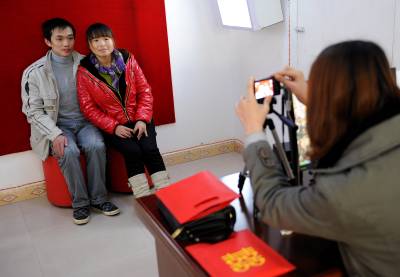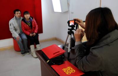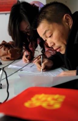 11日,一对新人在宣恩县民政局设立的结婚登记”绿色通道”办理结婚登记。该县常年在外务工人员达7万人。为方便趁春节回家的农民工够能够在短暂的假期中办好如准生证、结婚证、身份证等证件,当地民政、公安、计生、劳动就业等部门纷纷抽调人员开辟”绿色通道”,及时为返乡农民工办事提供服务。本报视界网宋文摄