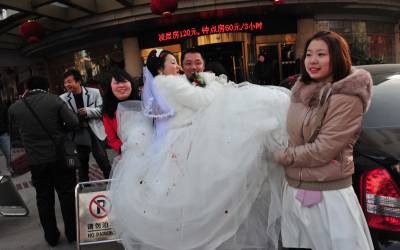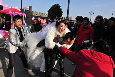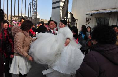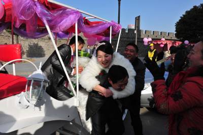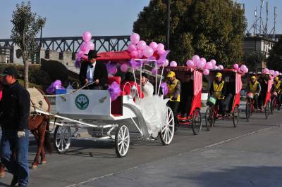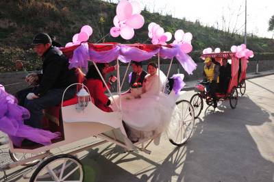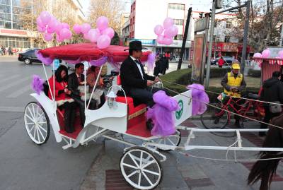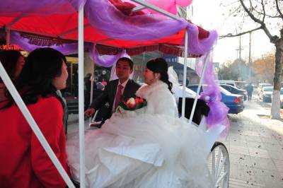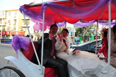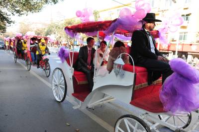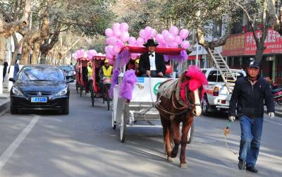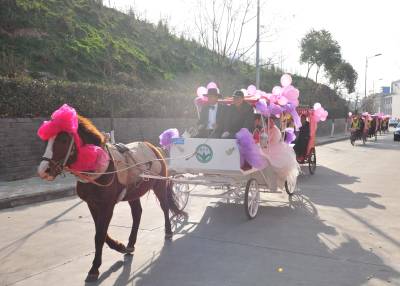 1月11日,湖北省襄阳市的薛先生,用马车迎娶新娘黎女士。婚前,他们想用一种新颖、环保、喜庆的方式迎娶新人,皇嘉盛典文化传媒给他们提出建议,用马车、人力三轮车迎娶新人,他们准备了一辆新颖的马车,请来多辆人力三轮车,扎上喜庆的气球,迎娶新娘。 在现场,新娘看到这种节能、喜庆的迎娶方式,非常高兴,她说,这是自己一生中最值得高兴的喜事,同时,这种方式,也给市民倡导的一种环保理念,坐马车,不仅环保,更让自己的新婚的当天,欣赏到古城美丽的风光。