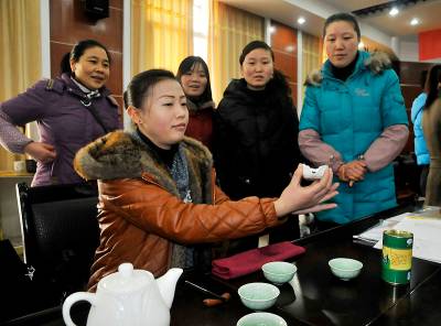 ”温壶,烫杯,装茶,高冲……”恩施市芭蕉侗族乡楠木园村的村民陈章英按照老师示范的步骤,演示起茶艺来。芭蕉侗族乡目前有茶园7.3万亩,是全国绝无仅有的茶叶大乡,也是全省第一历史名茶”恩施玉露”的发源地,在茶叶面积稳定下来后,如何进一步助农增收,该乡结合恩施市委提出的建设”仙居恩施”战略,转变经济发展方式,将茶园与茶文化结合起来打造,培育新型农民,大力发展旅游业。元月9日,乡里从中国茶叶学会、中国农业科学院茶叶研究所请来三位专家,对正在打造”恩施玉露”生态走廊沿线村、茶厂、农家乐的65名妇女进行茶文化培训,为芭蕉茶叶注入文化内涵,做强”恩施玉露”品牌,变茶叶为茶业,增加收入。据该乡负责人介绍,这次培训共五天时间,白天晚上均排满了课程。培训结束后,还将进行初级茶艺师资格考试,考试合格者将颁发劳动部认定的证书。通讯员伍功勋陈文昊摄