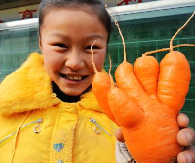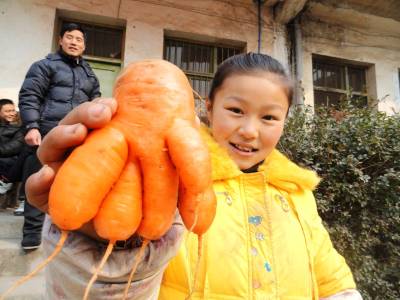 这是19日郧县刘洞镇一贯制学校的老师们从学校蔬菜基地里挖出的一个红萝卜,五个分叉,很像一只胖嘟嘟的人手。