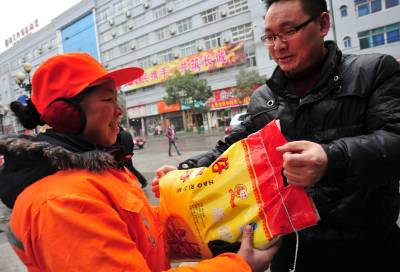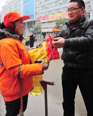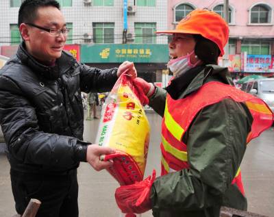 建始:社会人士自发慰问奋战一线环卫工人本报视界网刘波1月19日上午,建始县保安公司经理吴兵自发带着大米和植物油到县城大街小巷看望慰问冒风雪奋战在清扫一线的环卫工人:”你们辛苦啦!早祝春节快乐!”近两年来,该县广大环卫工人发扬”四不”、”四讲””四全”(不分白天黑夜,不论晴天雨天,不讲工作日和节假日,不说苦与累的苦干精神;讲责任、讲良心、讲感情、讲贡献)奉献精神,洁净的城市赢得广大市民啧啧称赞,每每环卫工人节或春节,县直单位和社会爱心人士纷纷走上街头,送慰问信、慰问金和物品,以此表达对甘于奉献的环卫工人敬佩之情。建始县新闻中心刘波联系电话13032794298
