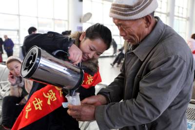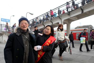 和谐春运我先行1月19日,82岁的赵孝文老人独自乘坐K370列车返回故乡孝感,孝感喟火车站春运共产党员突击队队员周繁见状连忙搀扶老人出站(图一);在候车大厅里,突击队队员胡宁、梁霞提着水壶给候车的乘客送上一杯杯开水(图二)。春运首日,孝感火车站客流平稳,由42名党员、团员、青年志愿者组成的春运突击队穿梭在各个角落,开展扶老携幼、引导购票、乘务疏导、协助安检等比奉献活动。 签约摄影师 晏美华 摄