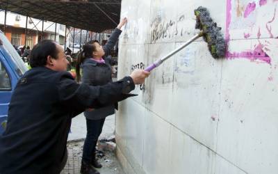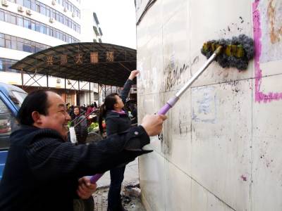 1月19日,湖北省郧县大碗厨酒店的老板黄海涛一大早就带领酒店服务员清除门前野广告,还有几天员工就要放假回家过年了。为干干净净过大年郧县各企事业单位和服务行业都在精心清扫清洗卫生责任区,以新的面貌迎接新春佳节。图为大碗厨酒店的老板黄海涛正与酒店服务员一起清除门前野广告时的情景。周家山摄湖北省郧县城管大队电话13872840078邮编442500