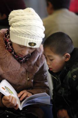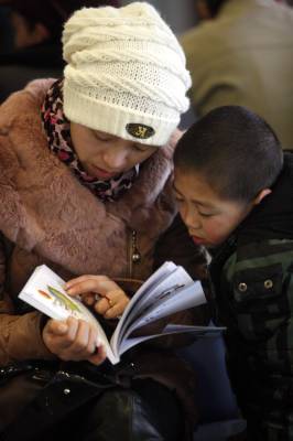 旅行不忘孩子学功课2011年1月19日,宜昌火车东站候车厅,一乘客聚精会神的教孩子读书学习。这名乘客来自湖北省恩施土家族苗族自治州,孩子今年7岁,随母亲在外打工,在回家过年旅途中,好好给孩子辅导功课。文振效
