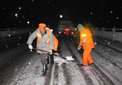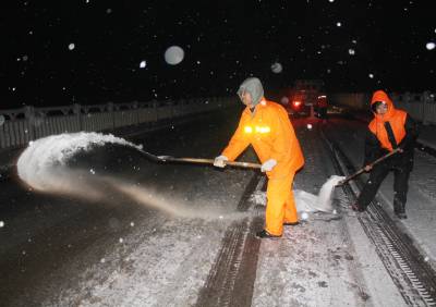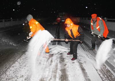 1月20日凌晨,孝昌发生降雪天气,积雪深度达3厘米。为确保孝昌境境内公路运行安全,该县公路管理局出动三个除雪防滑抢险突击队90余人、10台农用运输车,分别在该县列养公路主要桥梁、路段实行进行撒盐融雪。图为该局除雪突击队20日凌晨2点50分许在107北大桥进行撒盐作业。宋俊初摄