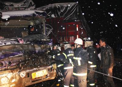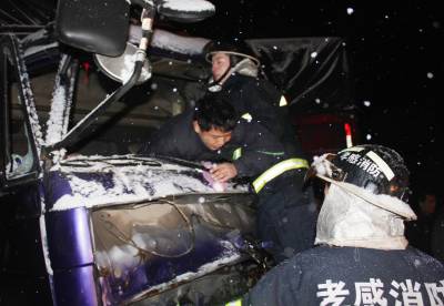 孝昌交警和消防冒雪联合营救被困司机(组)