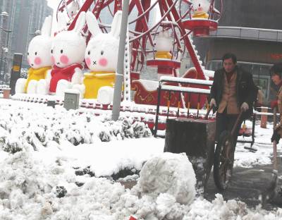 1月19日晚至20日早上,武汉迎来了第3场瑞雪。当日早晨,在汉口新华路菱角湖万达广场前,该场保洁人员正在自扫门前雪,安全方便为百姓。