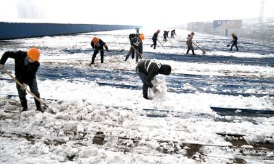 > 员工上房扫雪忙