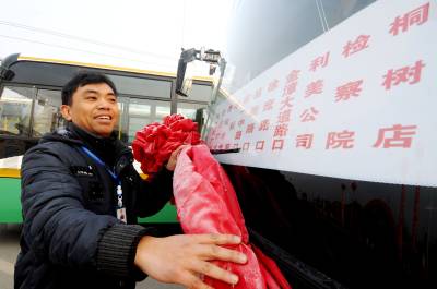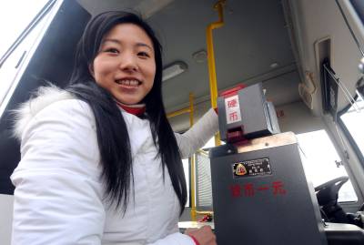 一名女青年兴高采烈地投币一元乘坐城区公交车。2011年1月21日上午,湖北省南漳县城区公交车正式开通营运。每一位乘客只需投币一元钱即可乘坐全程8公里的路程。这是南漳县委县政府和香港冠中巴士集团南漳水镜公司为该县人民办的一件实事。