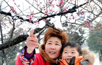 红梅花儿傲雪开21日,黄石市一名老人带着孙子在桥头公园欣赏傲雪盛开的红梅花。前天的一场暴雪降临该市,飘落在枝头的雪花还未消融,映衬着红梅花儿更加娇艳。黄石市黄石日报摄影部邱孝威摄电话:13807232603邮编:435002