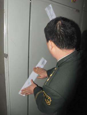 1月21日,湖北省郧县公安消防大队查处经济开发区一家火灾隐患严重的塑料制品生产厂家,当场断电停产,并在配电柜上贴上封条限期整改,并于当天组织各企业分管领导参加安全学习,布署春节期间的值班保安全责任追究制。目前郧县消防正分区对全县防火安全进行拉网式大检查。图一为消防参谋正在配电柜上贴上封条时的情景。图二为厂家负责人在查处通知书上签名时的情景。图三为装满油的油桶就。图四为大队长杨建华正在为各企业分管领导讲防火安全课时的情景。周家山摄湖北省郧县城管大队电话13872840078邮编442500
