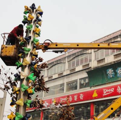 22日,郧县刘洞镇供电所人员正在对主街道的路灯进行彩灯更换。一串串火红的灯罩让古镇的年味更加浓厚.