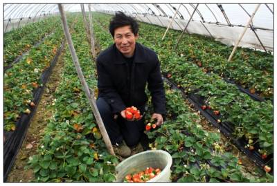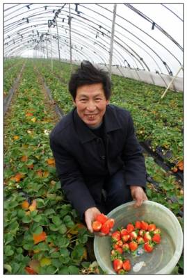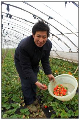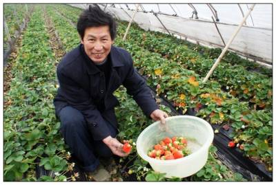 2011年1月22日,湖北省宜昌市夷陵区龙泉镇车站村农民万锡昌正忙着在草莓大棚内采摘草莓,准备运往市场上去出售。春节将至,草莓也正是上市时节,每公斤草莓价格达到12元。据万锡昌介绍,他家2亩多大棚草莓目前已创收1万元。近年来,夷陵区大力调整农村产业结构,发展大棚草莓、大棚西瓜,促进农民增收,目前该区已发展大棚草莓、大棚西瓜500余亩。周建平摄
