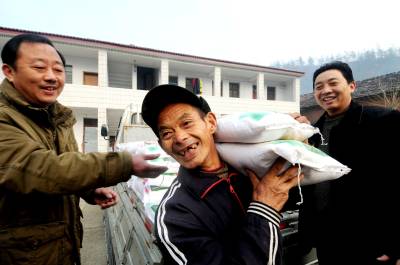 1月23日上午,福利院老人兴高采烈地从两个企业老板手中接过春节慰问大米。当日,湖北恒源宏置业有限公司老总分别来到南漳县李庙镇和肖堰镇福利院,把整车的爱心大米送给福利老人,以此表达对他们春节的问候。
