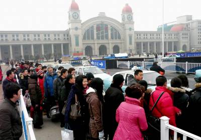 1月22日,武汉市汉口火车站站前广场的士停车处,等侯的士进入三镇城区的旅客和市民排起了长队。从一个侧面反映了春运汉口火车站进出站的人流,随着新春佳节的到来逐日在增涨。
