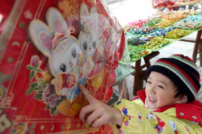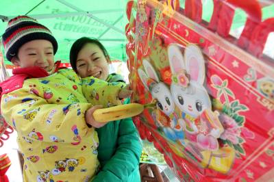 1月23日,一妇女带着小孩在长阳县街头选购装饰品。年关临近,各式各样的”兔”饰品成为市民必购的”年货”。(通讯员杜强)