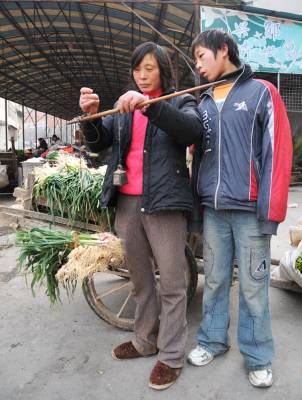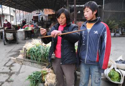 1月23日,家住湖北省郧县柳陂镇金矿村6组43岁的黄化荣天不亮就领着儿子拉着手拉车步行20多里来到县城兴郧市场卖自家的大白菜和葱,上午10时左右一对小俩口骑着一辆黑色摩托车来到市场买莱,男的在摩托车上没有下车车子也没熄火,女的来到黄化荣的菜车旁选了两把葱秤后给了100元钱,黄化荣找给了她95元钱,并找人看这张100元钱是真是假时,买葱女人坐上摩托车跑掉了,黄化荣记下车号为565号,经多人鉴定黄化荣收到的100元钱为假币,黄化荣只得报警并向警察反映被骗过程和车号,黄化荣与儿子一天的辛劳打了水漂。24日黄化荣天不亮又领着儿子拉了一手拉车菜来市场上卖,许多关心她的人过来问她派出所抓到坑她的人了没有?还有人告诉她23日这天骑黑色565号摩托车的男女在城里骗了几处卖莱的农民,一些人说过年了在外地打工的特别是在沿海地带打工的回家过年,带些假币回乡坑人。图为24日黄化荣与儿子拉了一车菜又在兴郧市场卖菜时的情景。周家山摄湖北省郧县城管大队电话13872840078邮编442500