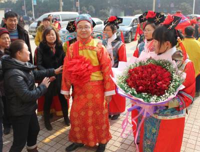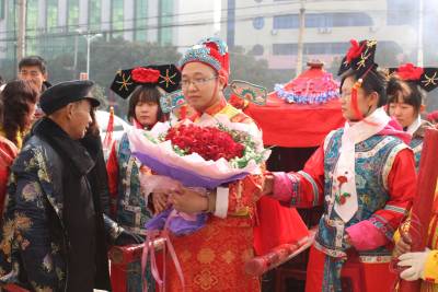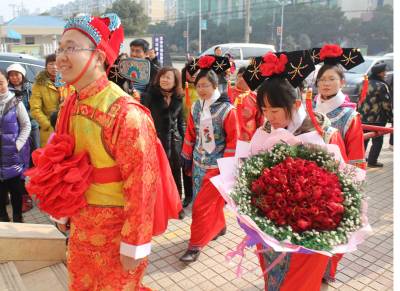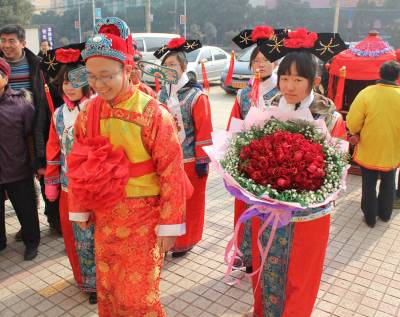身着古装的孝昌新郎骑着白马,花轿迎娶身着清朝宫廷服装的新娘。1月25日上午11时20分许,迎亲队伍到达该县新城区某酒店后,新郎将一捧玫瑰花献给新娘,一对身着古装喜服的新人,在酒店一楼大厅行古礼举行结婚仪式。据了解,这是一对”90后”新人,为了让自己的婚礼与众不同,他们决定回归传统,举办一场古装婚礼。宋俊初摄