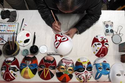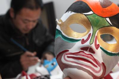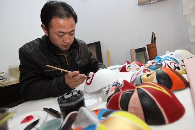 26日,湖北襄阳市民丁毅正在赶制参加当地春节庙会的民间传统面具。丁毅自幼喜爱美术,对傩面具情有独钟,不仅会制作面具,还能装扮成身穿披风的祭师做喷火表演,在当地受到许多商业的活动的欢迎。