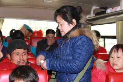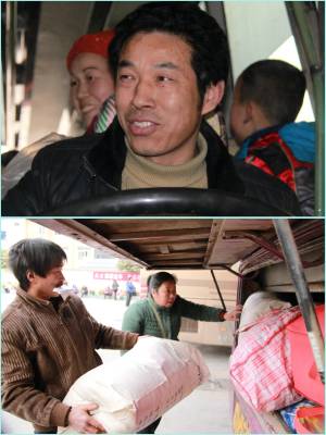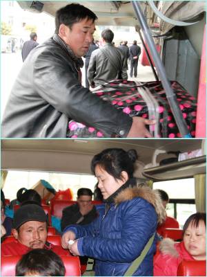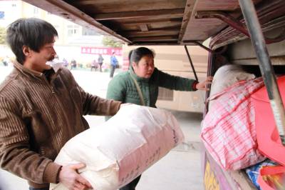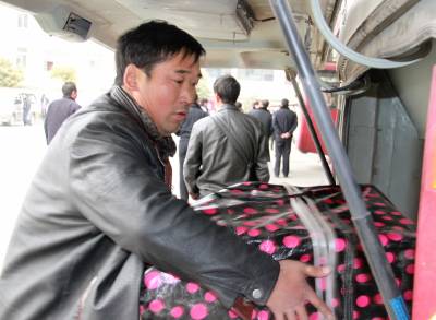 2011年1月26日下午,湖北省十堰市郧县九通汽车运输公司司机张刚全正准备开客车前往该县南化镇,他的妻子李永莲正帮乘客将货物装进客车后备箱。在该公司,丈夫开车,妻子卖票,共同战斗在春运一线的夫妻达30对,他们每年从正月初一忙到腊月三十,一年四季奔波于城乡之间,春运期间是他们最辛苦,最忙碌的时候,他们为广大农民工平安返乡发挥重要作用,做出了突出贡献。(湖北郧县新闻宣传中心曹忠宏摄)