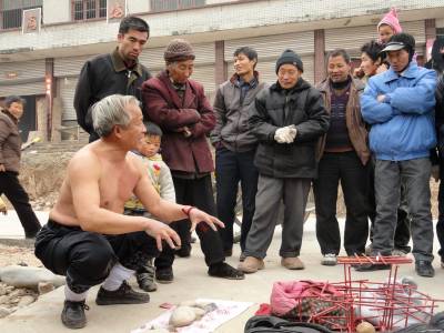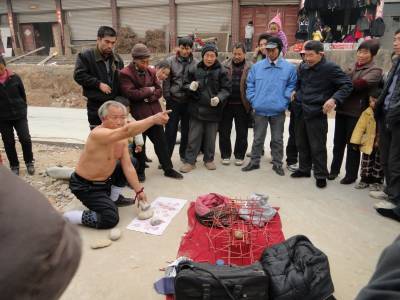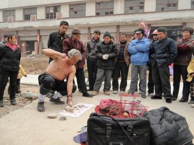 街头赤膊卖药人27日郧县刘洞镇街头一位满头白发的卖药人正在推销他的跌打药,凌烈的寒风中他赤膊表演赤手劈石功夫。(这么大岁数的人了,挣个钱都不容易啊!)