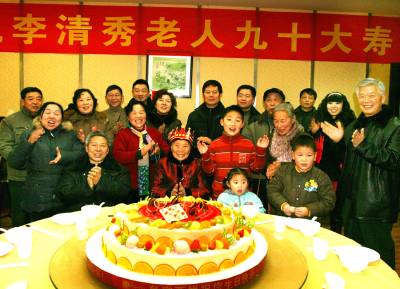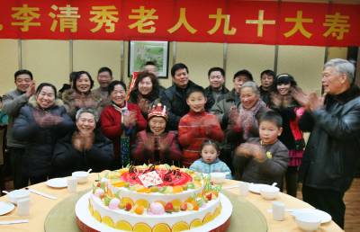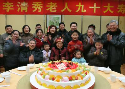 新年儿女齐聚为老母贺岁腊月二十四(农历小年),随州城区李清秀老太迎来90岁大寿,当天从四川、武汉、襄樊等地赶回的儿女孙们共四十多口人来到老人身边,其乐融融四世同堂,为老人祝寿。老人笑眯眯地说:”改革开放给我们带来的幸福日子可真好,我还想每天打扮得漂漂亮亮,活得开开心心,将来享受五世同堂的好福气。”本报视界网杨文明摄
