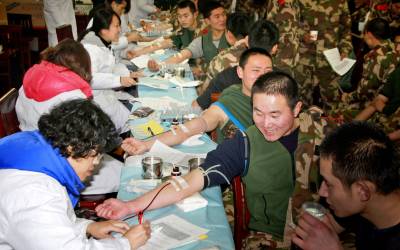 昨(29)日,省武警总队一支队400余名官兵在武汉陆军总医院参加义务献血。随着春节的到来,医院临床急救用血也到了高峰季节,了解到这一情况后,省武警总队一支队官兵踊跃献血,此次共计献血120000毫升,大大缓解了医疗机构临床用血的紧张状况。(记者柯皓本报视界网马威摄)