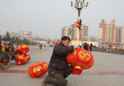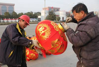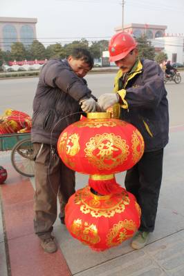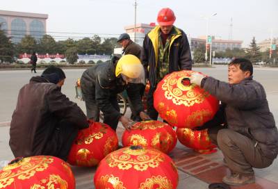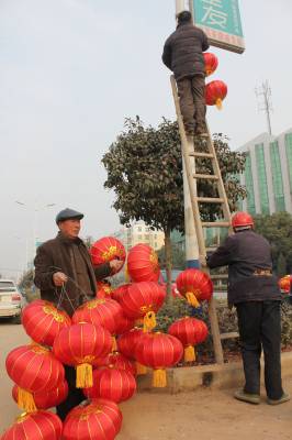 临近春节,为了营造新年气氛,孝昌县城管局组织回大小灯笼600余对,在该县新城区洪花路、平安路两侧及花园广场的灯杆上挂起来,红彤彤的灯笼煞是惹人喜爱,浓浓的年味扑面而来。图为1月29日下午,相关工作人员正在平安路和花园广场悬挂灯笼。宋俊初摄