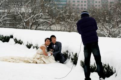 一对新婚青年在寒冬瑞雪下拍婚纱照,这是爱的火焰。