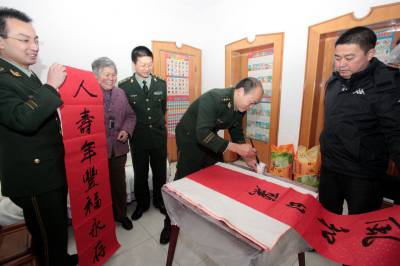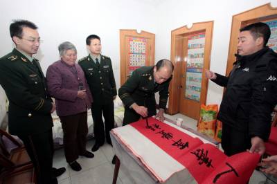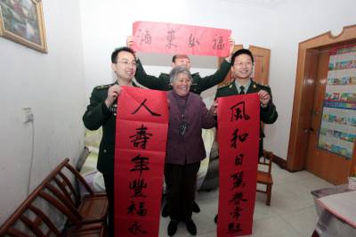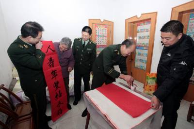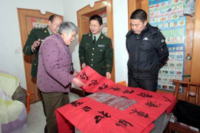 三峡:边检官兵为拥军妈妈写春联1月29日,三峡机场边检站官兵正在慰问拥军妈妈。当日,湖北边防总队三峡机场边检站官兵来到枝江市农业银行慰问全国拥军模范毛成秀。军旅书法家现场挥毫,为毛妈妈书写了:”风和日丽春常在,人寿年丰福永存,福如东海”的春联,表达了军人对54年如一日的拥军妈妈的无限敬仰之情。刘卫东摄
