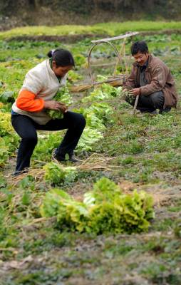 1月30日,宣恩县珠山镇莲花坝村的菜农们在采收蔬菜。兔年春节越来越近,但在宣恩县,勤劳的菜农们仍然劳作在田间,用她们的付出,为城市里的节日蔬菜市场提供可靠保障。田间没有城市里春节临近时的红红火火,但菜农们说:”其实这也是在‘忙年’,是农民迎接新春到来的一种方式——为自己在年前能够获得更多的收入,也为城里人过年能够吃到新鲜蔬菜!”本报视界网宋文摄