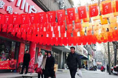 1月30日,在襄城西街,市民从有商家门前走过。春节临近,我市各个机关、商家开始用灯笼、彩旗装扮新春,营造喜庆、祥和的春节氛围。
