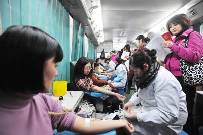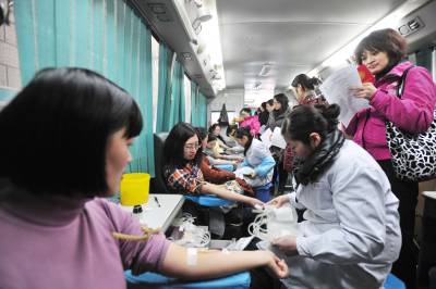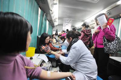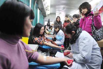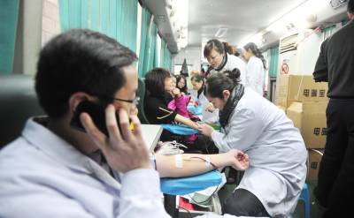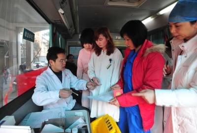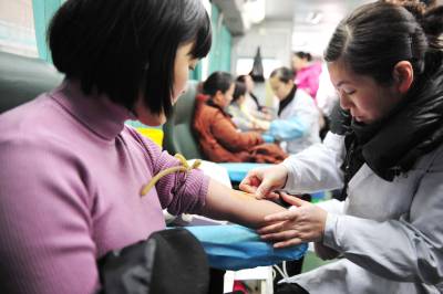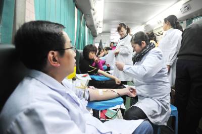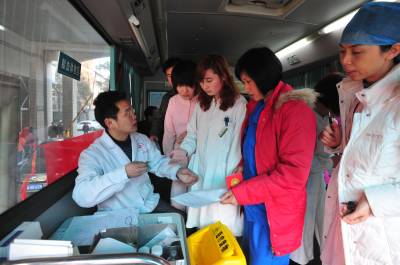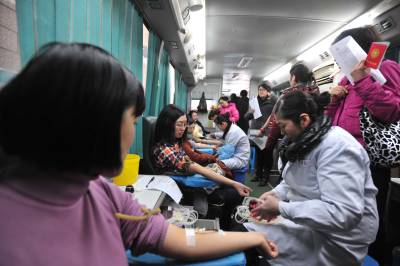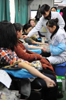 1月31日,湖北省襄阳市中心医院100多名医生、护士和工勤人员在医院内义务献血,他们用这种形式迎接兔年春节的到来。据了解,许多医务人员的献血量超过4000毫升。