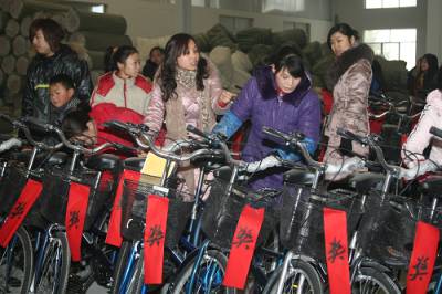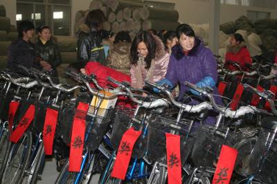 民营企业百名员工喜获环保自行车奖励1月29日,湖北钟祥金福祥纺织有限公司陈文婷、谢宇等百名纺织工人在该企业2010年度总结表彰大会上喜获液晶电视和轻便自行车等环保产品奖励。这家民营企业自1997年以来,在购买彩电、手机等物资奖励员工外,每年都要购买100辆自行车奖励公司员工。女工们高兴地说,公司给我们奖励自行车,既环保又适用。本报视界网赵云福摄