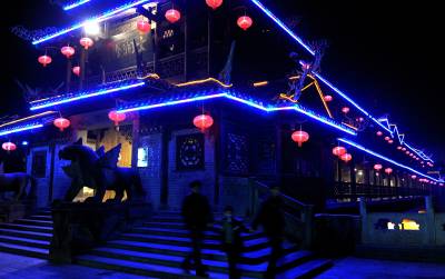 1月31日拍摄的侗乡风雨桥。兔年新春即将来临,位于湖北宣恩县城区河段上的侗族特色建筑——风雨桥上灯火璀璨,喜迎新春。本报视界网宋文摄