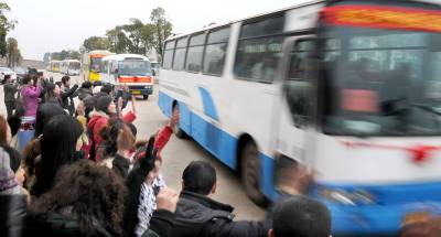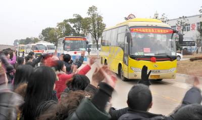 欢送农民工回家过年2011年2月1日,湖北美岛服装有限公司机关干部欢送公司500多名外地打工妹回家过年。该公司有员工近3000名,其中有500多名来自省内各地的打工妹,为送她们安全回家过年,公司每年租用十几台大客车把打工妹送回家过年。黄石市黄石日报摄影部邱孝威摄电话:13807232603邮编:435002