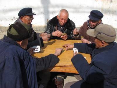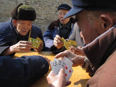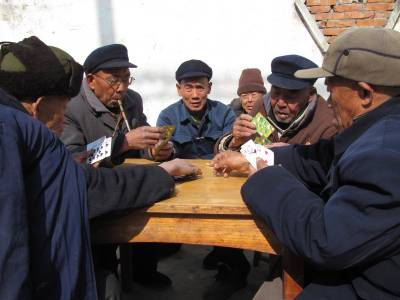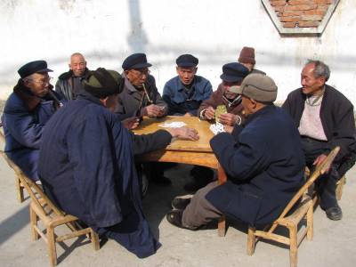 2011年2月1日,湖北省十堰市郧县刘洞镇福利院的孤寡老人们正在打扑克。当天老人们聚集在院落里,有的下棋,有的打扑克,有的打乒乓球,欢声笑语不绝于耳,他们在这里老有所养,老有所乐。