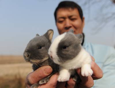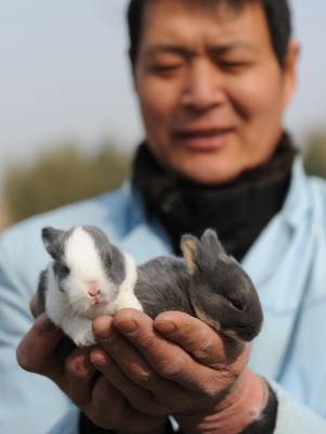 宠物兔受宠”本命年”1日,湖北省潜江市渔洋镇成杰宠物兔业公司员工在展示宠物兔。随着宠物兔”本命年”的到来,宠物兔更加受到顾客宠爱,该公司的各种宠物兔格外俏销,供不应求,春节前已经销售2000只宠物兔到北京、上海、西安等地。该公司现有种兔1000只,每年销售宠物兔20000只左右。吴燕军摄