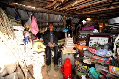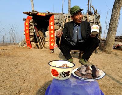 ”现在生活好了,天天都象在过年,别看我一个糟老头子,日子过得还是有滋有味的。”2月2日(除夕),湖北省郧县杨溪镇刘湾村三组一位年逾古稀的农民刘明瑞高兴地告诉笔者。 因父母过世较早,家境贫寒的刘明瑞一直独身。1983年他从汉江河边搬迁后靠到一山包上(整个村庄后靠),因当时没钱盖房,他就住进了别人废弃的猪圈里,这一住就是28年。28年来,他没有成过家,家里没有用过电,睡觉没铺过垫被(无论春夏秋冬),没有厨房(在另一个废弃的露天猪圈里将就,下雨时打伞做饭),家里没有上过门(出门或夜间只是用一块木板堵着)几乎过着原始生活。如今他耕种了2.1亩田地。农闲时节,他以拾破烂为荣,每天将拾来的破烂送到县城出售,月收入400多元,顺便带回日用消费品,小日子过得象”活神仙”。本报视界网吴成林摄