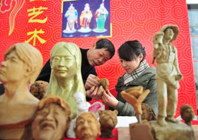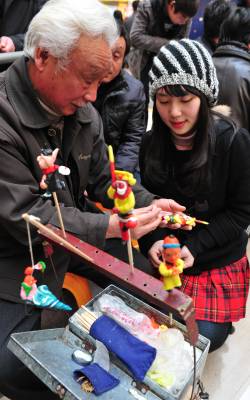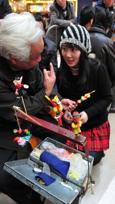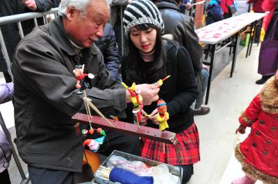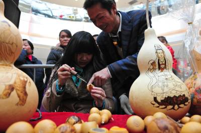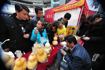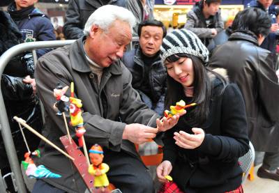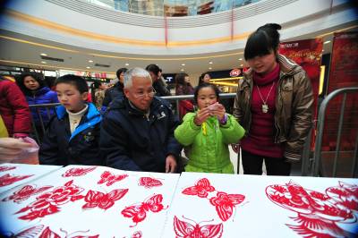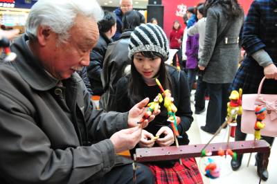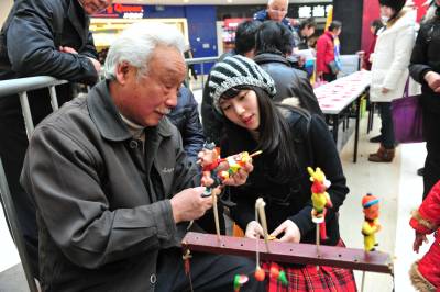 2月4日,在湖北省襄阳市举办的赏民俗文化主题活动中,市民在向民间艺人学习绝活技艺,当天,农历正月初二,立春时节,湖北襄阳市的泥塑、剪纸、面人、烙画、皮影等各类民间艺术大师,在游客集中的万达广场,展示民间绝艺,并向愿意学习的市民传授这些绝艺,让传统民俗能够传承下去,据介绍,这些民间艺术大师将用半个月的时间向市民展示、传授这些技艺。 春节期间,享受长假的市民们通过观玩、体验的方式快乐学习、增长见识,学习技艺,度过一个充实又有意义的春节。