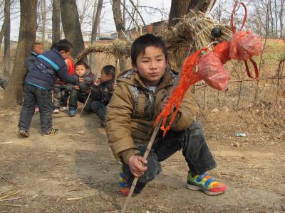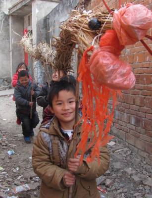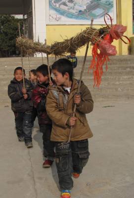 2011年2月6日下午,湖北省十堰市郧县刘洞镇刘洞村的一群小孩子打着草龙走在村子里。当天村里的孩子看到大人们走街串巷舞龙贺新年,也模仿大人们,舞动着自编的草龙在村子里奔走玩乐,孩子们的趣味活动为新春佳节增添了喜庆祥和的气氛。(湖北郧县新闻宣传中心曹忠宏摄)