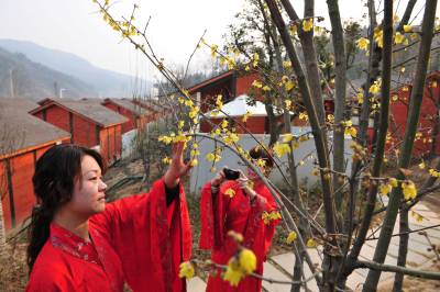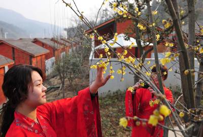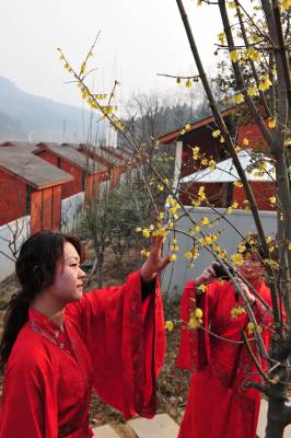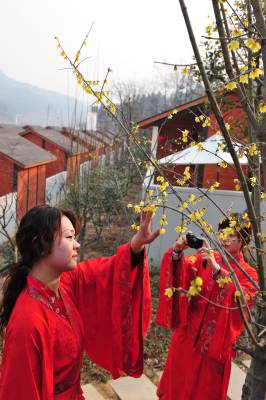 2月6日,在湖北襄阳凤凰山水温泉,两名身着汉服的少女在欣赏拍摄盛开的蜡梅花,春节期间,湖北襄阳艳阳高照,气温宜人,各个景区游客爆满,据旅游部门介绍,今年春节期间,湖北襄阳景区游客总量创历年最高。