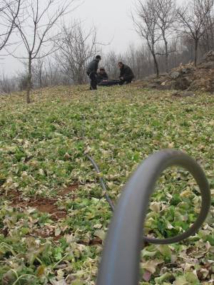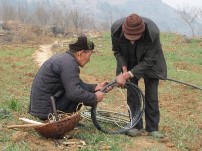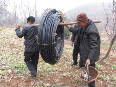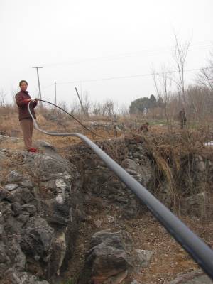 2011年2月7日,湖北省十堰市郧县刘洞镇杨河村村民正架水管准备为干涸的水窑抽水。去年10月至今,因该县持续少雨天气,导致村里各家饮用水水窑陆续干涸,为解决人畜饮用水问题,村民们架水管从偏远的池塘向水窑抽水。