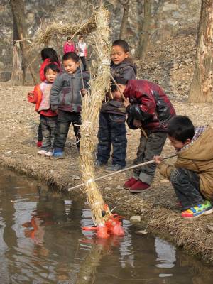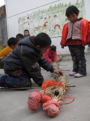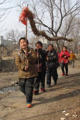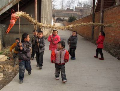 2011年2月6日下午,湖北省十堰市郧县刘洞镇刘洞村的一群小孩子打着草龙走在村子里。当天村里的孩子看到大人们走街串巷舞龙贺新年,也模仿大人们,舞动着自编的草龙在村子里奔走玩乐,孩子们的趣味活动为新春佳节增添了喜庆祥和的气氛。